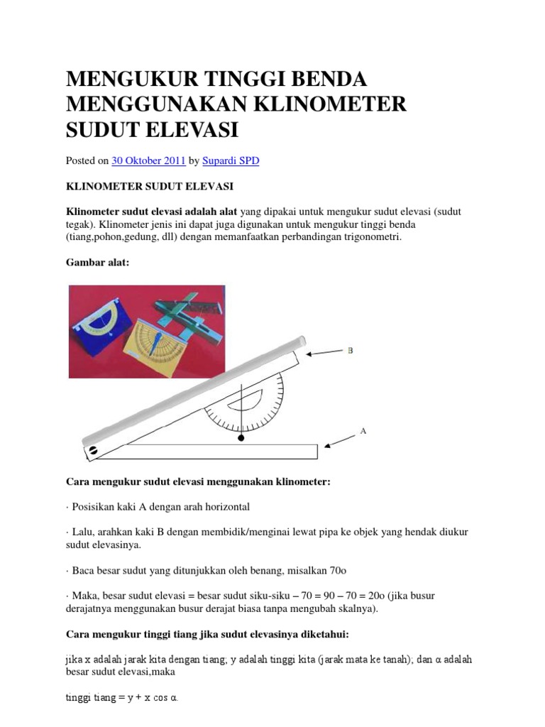 Suatu pohon yang tinggi menjulang memiliki panjang bayangan 37,5 m di suatu pagi dan 12,5 m di suatu sore. Mengantisipasi hasil dan tindakan (anticipate and act) 7. Begitu juga dengan mengukur tinggi obyek lainya seperti pohon, menara , atau berapa tinggi layangan kita terbang kalau perlu. Sudut elevasi dan depresi konsep matematika koma. Penggunaan klinometer penggunaan klinometer untuk mengukur tinggi benda, dapat diilustrasikan sebagai berikut.