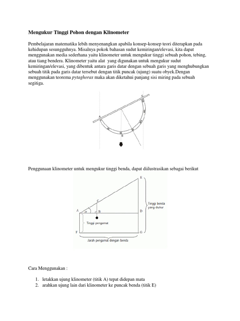 Akhirnya, kita dapat menghitung tinggi pohon atau bangunan dengan rumus: Csc α = α 1 sin sec α = α 1 cos cot α = 1 tan α. Pada bagian ini saya akan mencoba menjelaskan cara menghitung tinggi sebuah menara menggunakan metode trigonometri dan penerapannya pada program java dengan mengetahui sudut dan jarak dari titik pengukuran hingga kaki menara dengan rumus : Mengukur tinggi pohon dengan klinometer. Materi, rumus, contoh soal, pembahasan rumus phytagoras (teorema pitagoras) dan contoh soal pythagoras moshimoshi: Pengukuran tinggi pohon yang paling akurat yaitu menggunakan suunto clinometer dan haga hypsometer karena memakai prinsip trigonometri dalam pengukurannya. Metode ini memanfaatkan teori kesebangunan segitiga. Tinggi tiang, tinggi pohon dan tinggi sebuah bangunan. Menggunakan kesebangunan segitiga cara menggunakan klinometer menggunakan segitiga adalah sebagai berikut: Menghitung tingginya nanti ketika sudah kembali ke basecamp. Menuliskan semua rencana/ide dari setiap anggota yang muncul. Klinometer adalah alat sederhana untuk mengukur sudut elevasi antara garis datar dan sebuah garis yang menghubungkan sebuah titik pada garis datar tersebut dengan titik puncak sebuah objek. Atau kembali dalam bahasa inggris, tinggi pohon adalah tinggi kali anda jarak dari wajan ke pohon dibagi dengan jarak dari anda ke wajan.